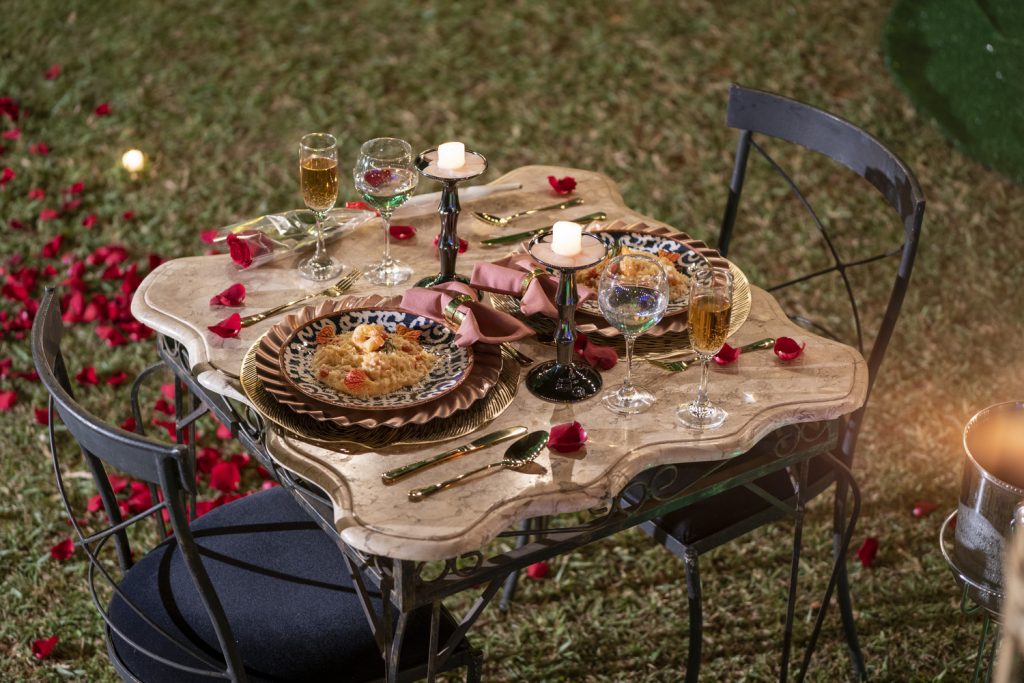 - Montagem e decoração no jardim, no restaurante ou na trattoria (10% de taxa de serviço não opcional para montagem do pacote no local)